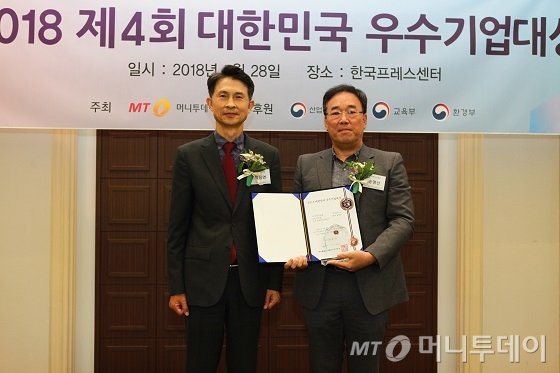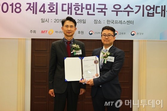 송영선 인프라닉스 대표(사진 오른쪽)가 'IT서비스대상 3년 연속상'을 받고 박종면 머니투데이 대표와 기념사진을 찍고 있다/사진=중기협력팀 오지훈 기자